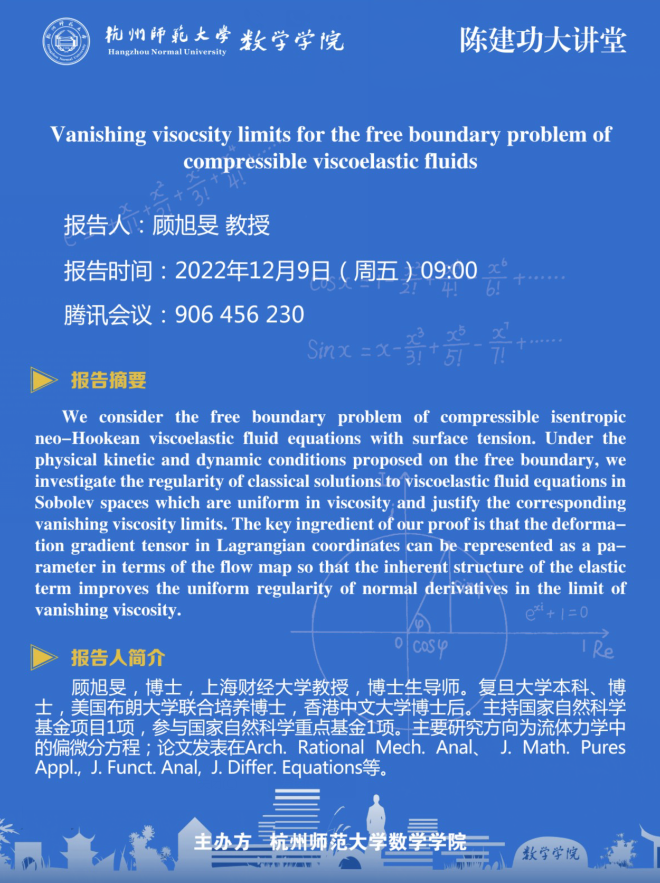 陈建功大讲堂:Vanishing visocsity limits for the free boundary problem of compressible viscoelastic fluids