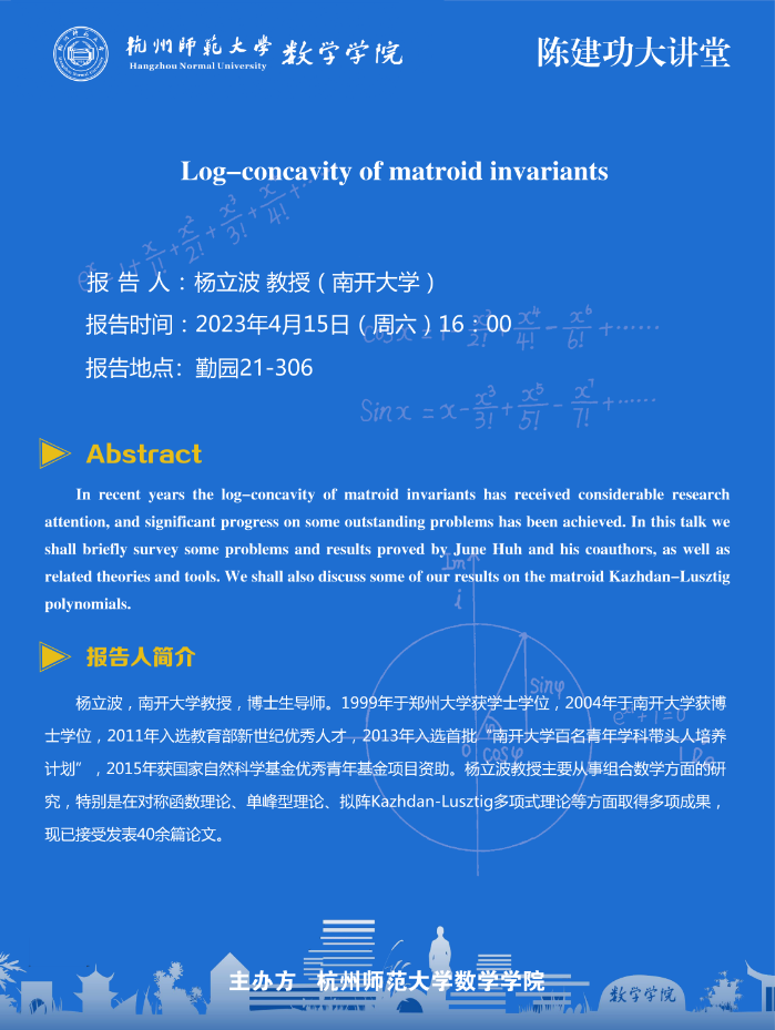 陈建功大讲堂:Log-concavity of matroid invariants