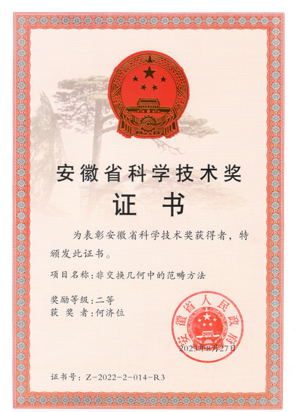 近日,安徽省科学技术厅公布了2022年度安徽省科学技术奖专业(学科)评审结果。欧美av在线何济位教授参与的项目“非交换几何中的范畴方法”获二等奖。本项目隶属代数学领域,主要研究非交换几何领域若干重要代数类的环论性质、同调性质和表示理论,如Poisson代数、Hopf代数作用的不变子代数、PI代数等,是代数学、代数几何、数学物理等领域共同关注的重要研究领域。